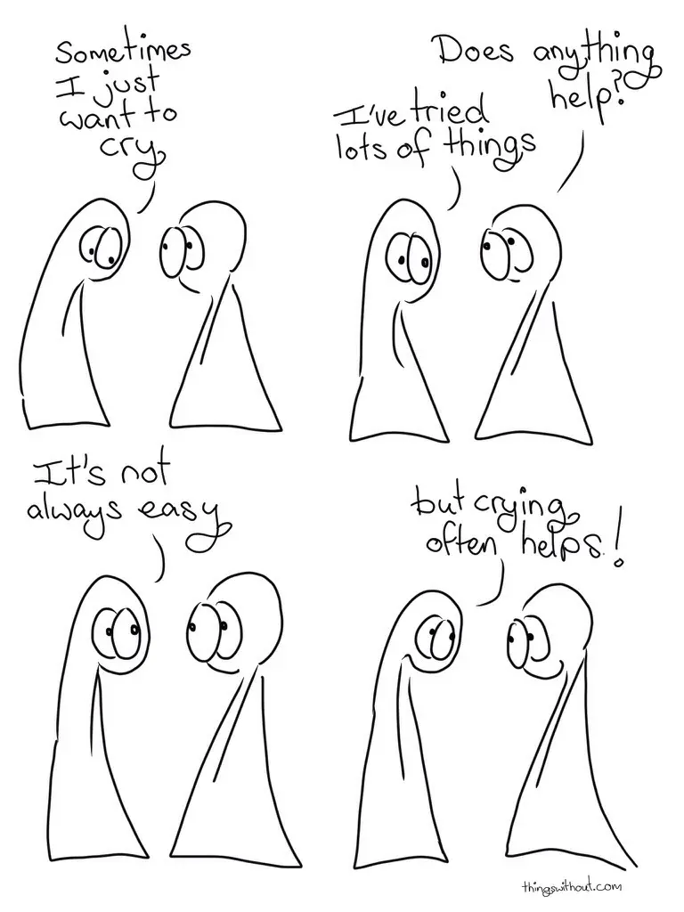 Thing 1: Sometimes I just want to cry. Thing 2: Does anything help? Thing 1: I've tried lots of things. Thing 1: It's not always easy Thing 1: But crying often helps!